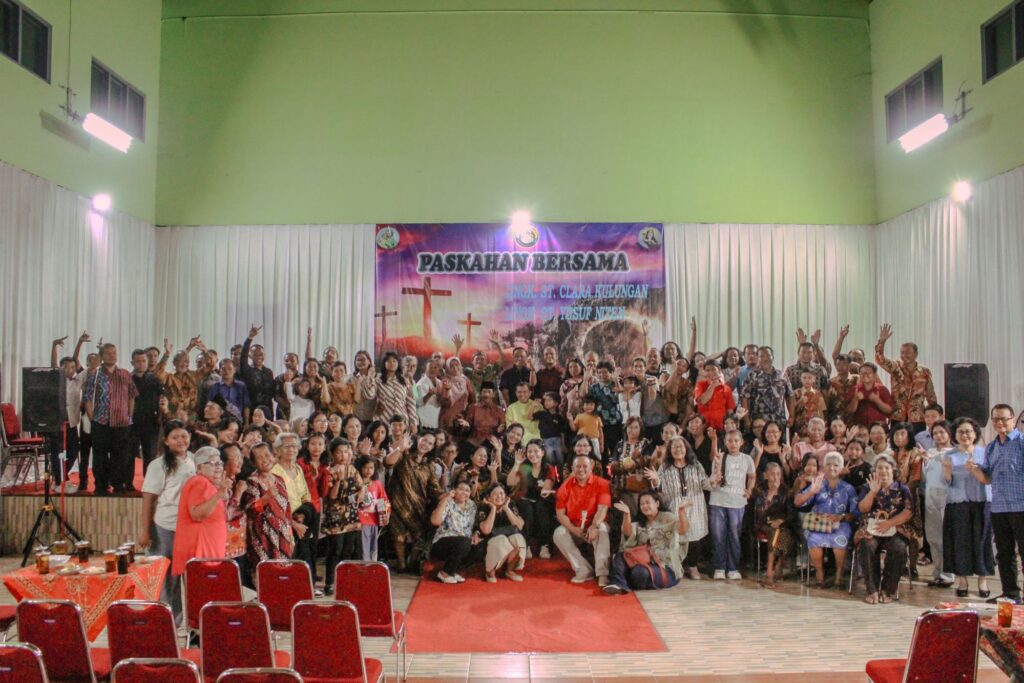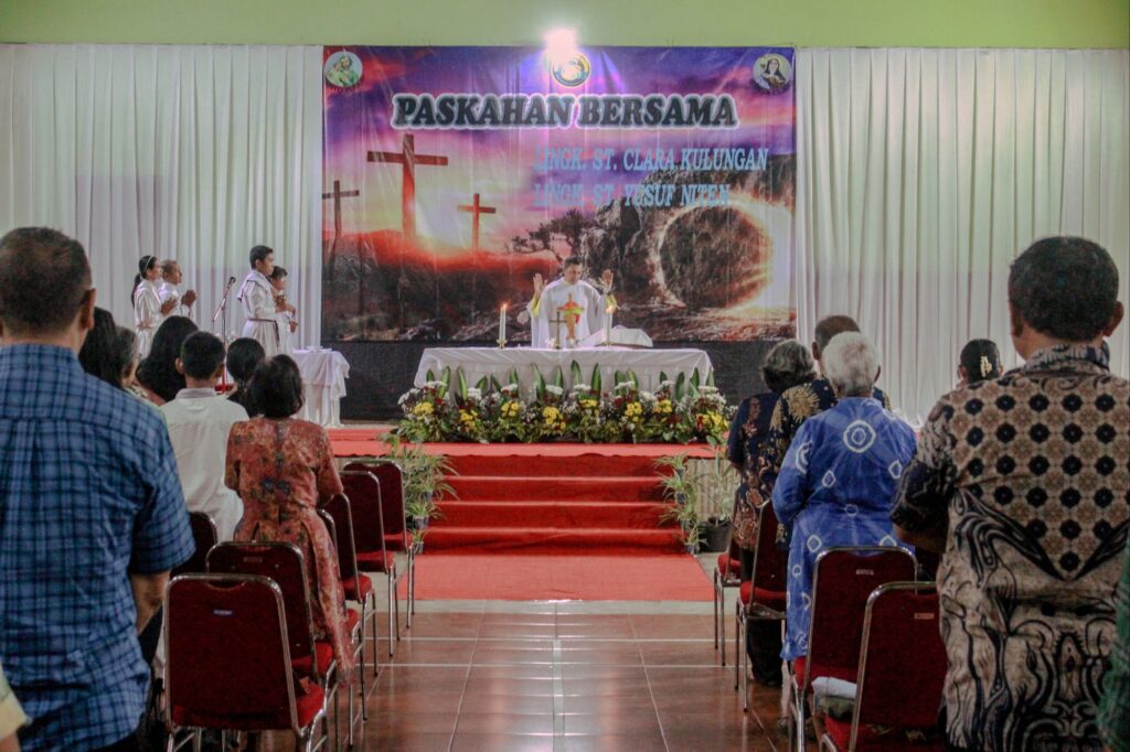 Umat Lingkungan Santa Clara Kulungan dan Santo Yusup Niten menggelar Paskah bersama dalam rangka program Sambang Srawung Sedulur (S3) di GOR Gadungan, Selasa (7/4/2026). Kegiatan diawali dengan perayaan Ekaristi yang dipimpin oleh Romo Basilius Edy Wiyanto, Pr, kemudian dilanjutkan dengan sambutan dan hiburan yang menambah sukacita kebersamaan. Berdasarkan berita acara panitia, kehadiran umat dalam kegiatan ini mencapai 92,2 persen.